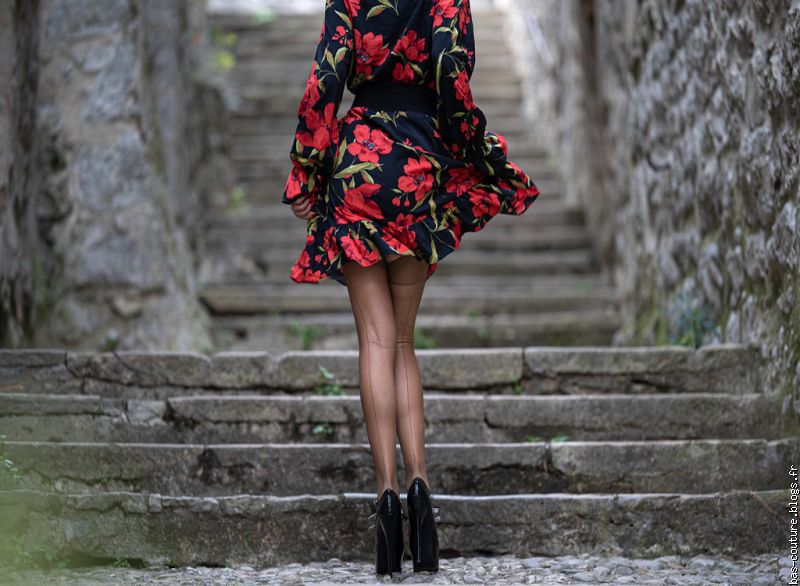 | 1 - Je suivais une paire de jambes gainées de bas coutures. |